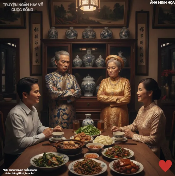 Mẹ tôi lảo đảo, phải vịn vào thành bàn, hai tay bà run rẩy nắm chặt vạt áo. Bố tôi thở dốc, vẻ mặt ông méo mó vì bị xúc phạm. Tôi nhìn mâm cơm còn nguyên vẹn, nước mắt trào ra. Tôi quay sang Quốc, người vẫn còn đứng như trời trồng giữa phòng.