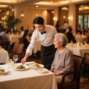Giữa cơn mưa tầm tã buổi chiều, một chàng trai trẻ dừng tay lau bàn, dúi phần cơm cuối cùng của mình vào tay một bà lão…