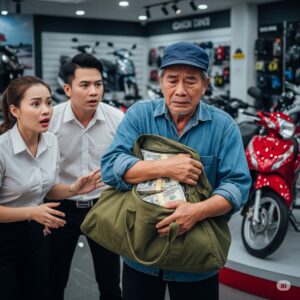 Ông bước thẳng vào quầy, chỉ tay về phía chiếc xe SH đời mới trưng bày giữa sảnh: “Cho tôi xem chiếc này. Tôi muốn mua.”