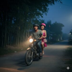 Đêm tan, tôi chở mẹ về. Qua bụi tre vàng, gió rịn mùi lá non. Mẹ bảo: “Dừng một chút.” Tôi tấp vào. Mẹ xuống, đứng trước lối vào – chỗ hôm đầu tiên mẹ gọi tôi rẽ – rồi quay lại, giọng đùa mà không hẳn đùa: “Con rể, cho mẹ rủ con vào trong đó thêm lần nữa.”