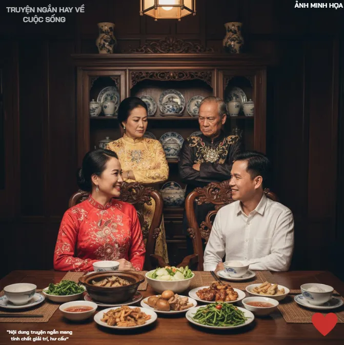 Quốc vội vã đỡ lời bố mẹ, kéo họ ngồi xuống chiếc ghế gỗ đã được đánh bóng kỹ lưỡng, chiếc ghế mà bố tôi đã dành cả buổi sáng để lau chùi cẩn thận. “Bố mẹ, đây là An, và đây là mâm cơm bố mẹ An đã chuẩn bị rất chu đáo.” Quốc nhìn tôi, ánh mắt đầy sự cầu khẩn và xin lỗi, anh đang cố gắng giữ lại chút danh dự cuối cùng cho tôi và gia đình tôi.