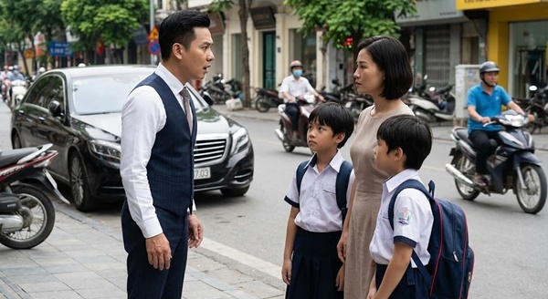 Khi hai đứa trẻ đi khuất, Hùng không kìm được nữa, lao đến nắm lấy tay vợ cũ: — “Chi… hai đứa trẻ đó… là con anh đúng không? Chúng giống anh y đúc. Em giấu anh suốt 15 năm qua sao?” Lan Chi gạt tay Hùng ra, phủi nhẹ chỗ áo vest anh vừa chạm vào như phủi bụi bẩn: — “Giấu? Anh nghĩ anh xứng đáng để tôi phải giấu giếm sao, Hoàng Hùng?”
